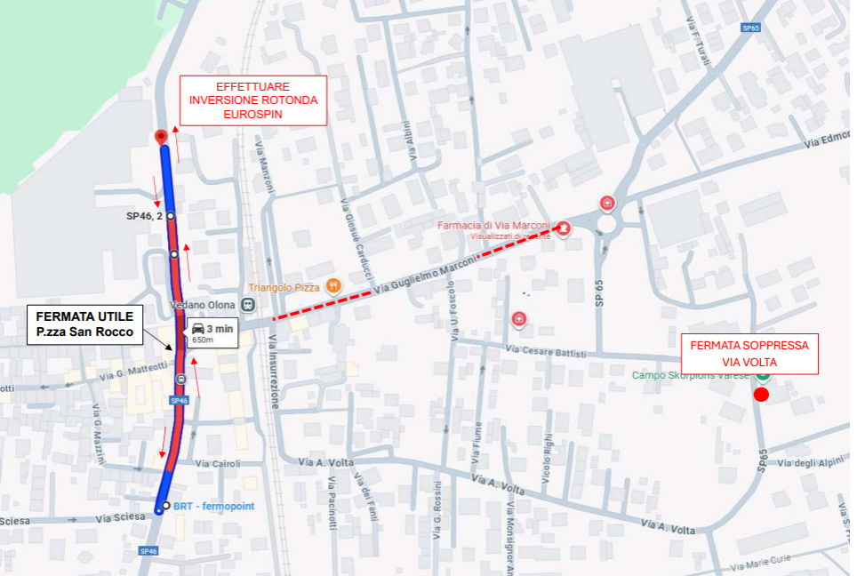 A causa della chiusura di via Marconi nel comune di Vedano Olona, dal 27 Ottobre al 2 Novembre sara’ soppressa la fermata di via Volta.